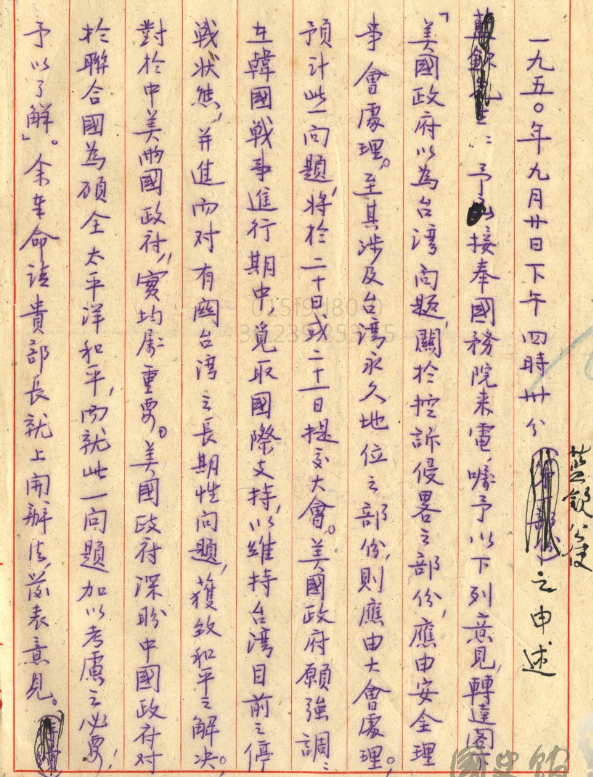 接下來我們提到韓戰也導致維持現狀,在1950年9月20號,藍欽當時是公使,接奉國務院來電,囑予以下列意見轉達閣下,也就是告訴外交部長葉公超說,美國政府以為台灣問題,因為發生了韓戰,所以你們在聯合國控訴蘇聯侵略之部分。應由安全理事會處理,至其涉及台灣永久地位之部分,則應由大會處理。美國政府願強調在韓國戰爭進行期中,爭取國際支持,以維持台灣目前之停戰狀態,進而對有關台灣的長期性問題,獲致和平解決,對於中美兩國政府其實都很重要。意思就是說,目前韓戰正在進行,所以維持台灣目前的狀態,然後長期和平解決,這個是很有利的。