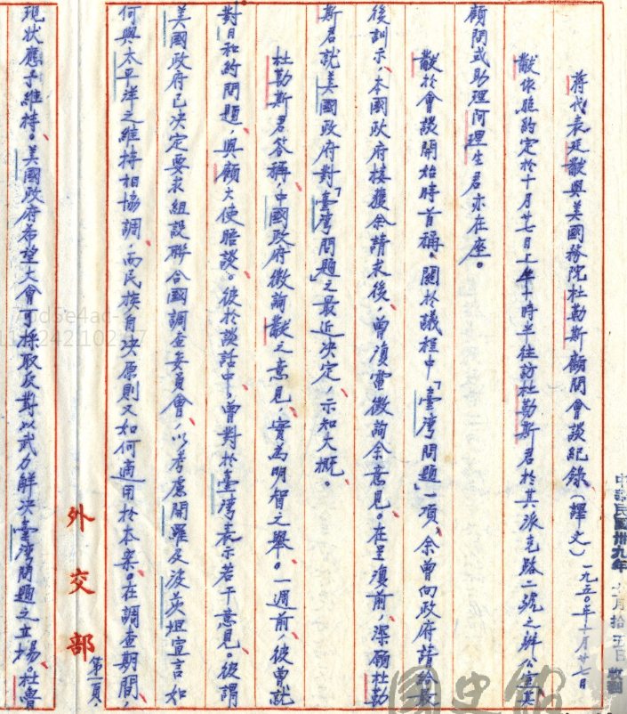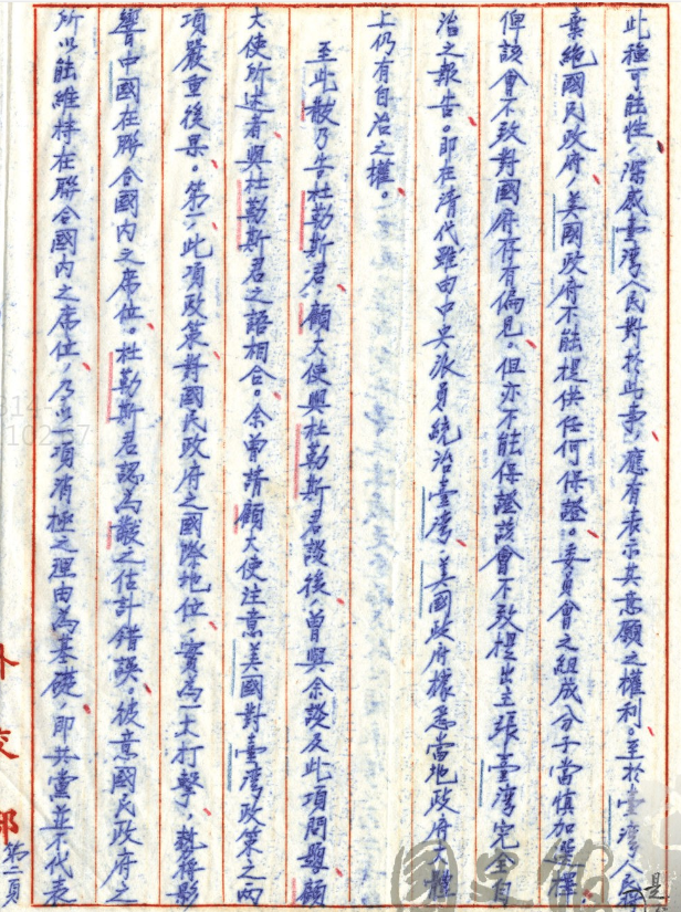 接下來呢我們就可以看到蔣廷黻對杜勒斯說如果美國對台灣問題要採用台灣人民自決的話,這樣對國民政府的國際地位就是一大打擊,會影響中國在聯合國內的席位。杜勒斯就說你這樣講不對,國民政府之所以能夠維持在聯合國裡的席位是一種消極的理由,就是共黨並不代表中國。但是這種事情老實講,是一個非常消極的理由,當時美國以前是這種態度。