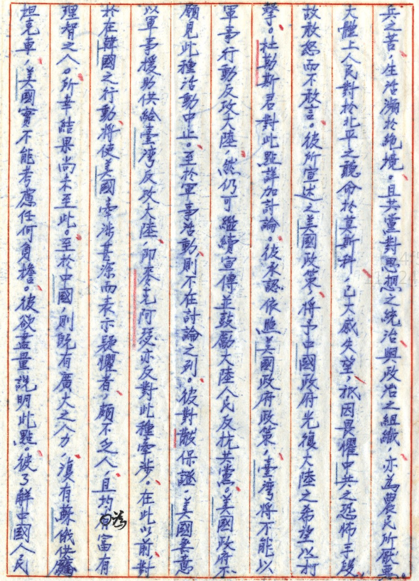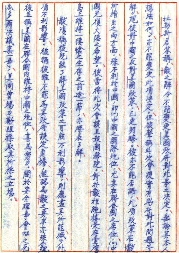 杜勒斯君對此詳加討論,他承認如果照美國政府的政策,台灣是不能用軍事行動反攻大陸的,但是可以繼續宣傳鼓勵大陸人民反抗共黨,那美國政府就是說這種行動我們就繼續沒關係,但是軍事活動就不要討論。杜勒斯保證美國無意以軍事援助台灣反攻大陸,就麥克阿瑟也反對。意思就是說你們也不要覺得麥克阿瑟對你們有多支持,因為麥克阿瑟是最早發明說台灣是所謂不沉航空母艦,所謂第一島鏈的人。但是杜勒斯說你聽我的,麥克阿瑟其實也都沒有在支持這件事情,所以中國又有廣大的人口,又有蘇聯供應武器,所以美國實在不可能去介入反攻大陸,基本上話都講得很白了。