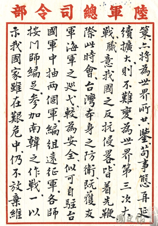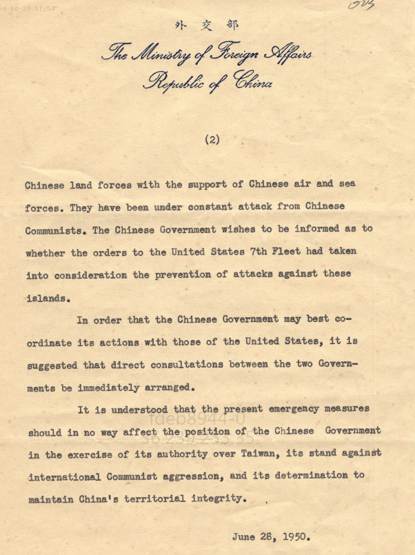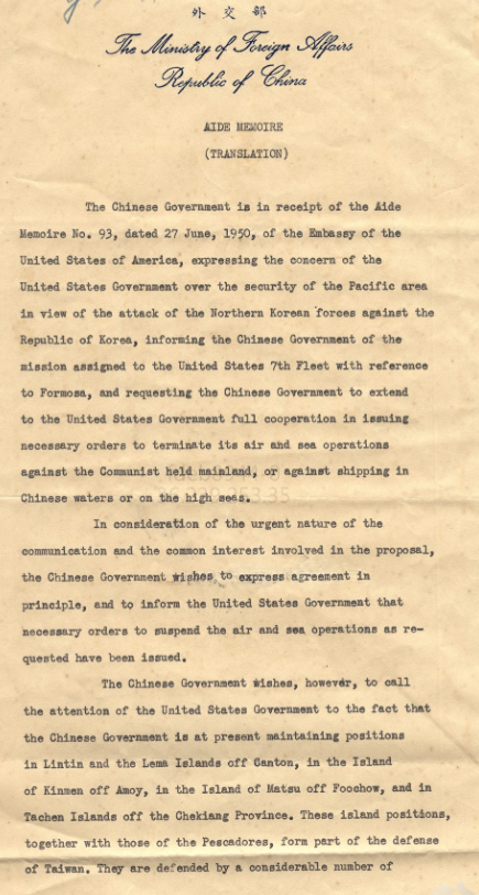 韓戰爆發之前,其實美國已經預料中華民國是守不住台灣。在韓戰爆發之後,1950年6月27日,美國遞交給台灣的備忘錄,大家看到就是這張泛黃的紙片,這張泛黃的紙片其實就是中華民國生存,從民國39年到現在110年的命脈,也是每個台灣人都應該要讀的,我覺得這個應該要列入歷史課本作為紀念,因為這張紙決定了台灣的安全以及未來。這張紙就是在韓戰爆發之後,美國緊急跟中華民國遞交了一份備忘錄,就是說「美國政府對於北韓軍隊進攻大韓共和國,就大韓民國,所引起的太平洋區域安全問題,由於其本身在日本的責任及其對於該區和平的一般注意,不能予以漠視,因此美國第七艦隊奉令阻止來自中國大陸以台灣為目標之攻擊,並已完成必要部署。」也就是說大家可以看到這就是美國協防台灣的依據,從那個時候一直到今天2022年,我們可以看到可以說台灣的關鍵命運,就掌握在這張紙上,第七艦隊已奉命阻止來自中國大陸以台灣為目標,在今天2022年6月25號,我們來緬懷這段歷史。