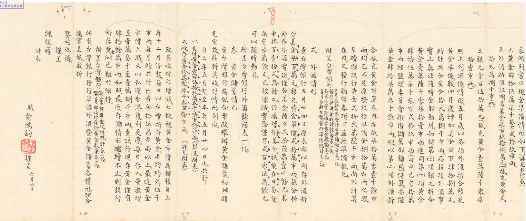 現在大家有沒有看到這是台灣銀行發行準備的畫面,這個就是在史料裡面我們發現到的就是當時台灣的經濟狀況,這個大家都很清楚,某些人經常講說國民政府帶了黃金來穩定了台灣的金融救了台灣,但是我們來看到這是1950年6月3號,就是韓戰爆發前,有關於中華民國的財政經濟狀況具體的事證。這是1950年6月3號,俞鴻鈞是當時的行政院長、向蔣中正報告黃金的狀況。大家看到這個的準備情形,中央台灣銀行發行黃金,當時提到自上年(1949年、民國38年)6月起至11月起,按月發行檢查報告,均以黃金十足準備,至上年12月據稱,因應墊付軍政費,準備已感不足,也就是說那時候黃金已經不足了,所以就只好繼續調黃金,於是續由本行撥借黃金22萬6千市兩,然後到本年4月,就是1950年、民國39年4月,黃金準備又形不足了,怎麼辦呢?