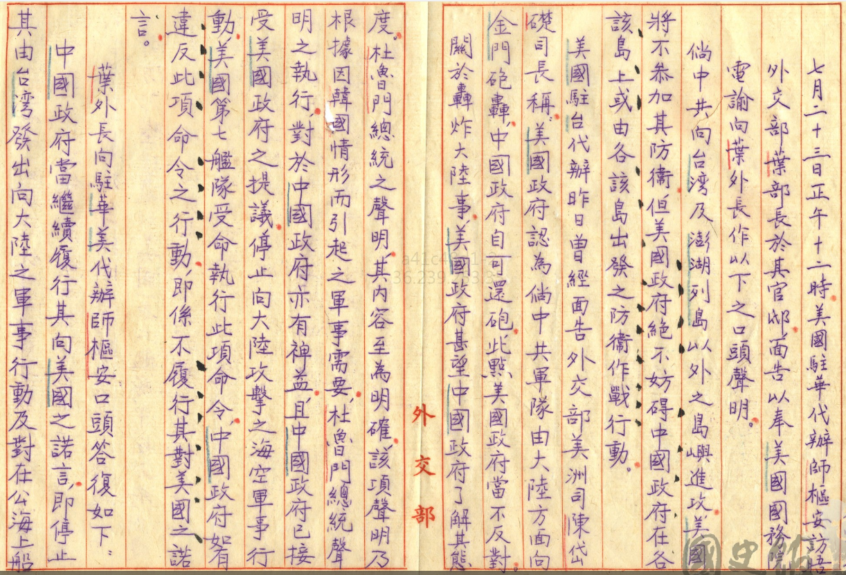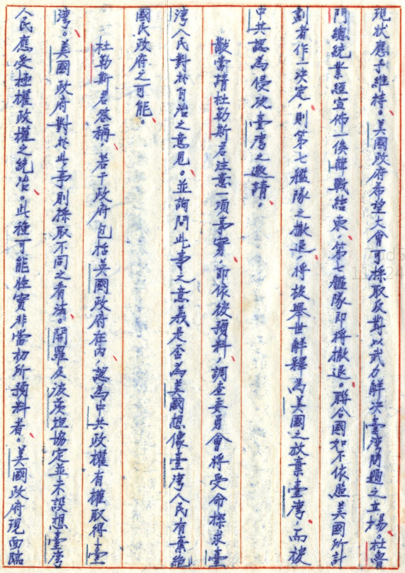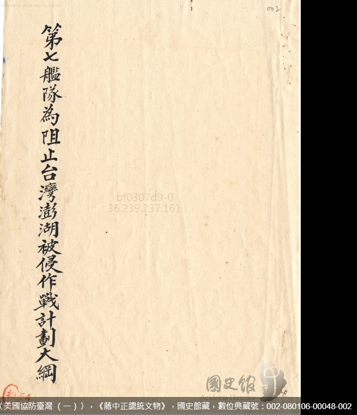 文件九:〈美國協防臺灣 (三)〉,《蔣中正總統文物》,國史館藏,數位典藏號:002-080106-00050-007