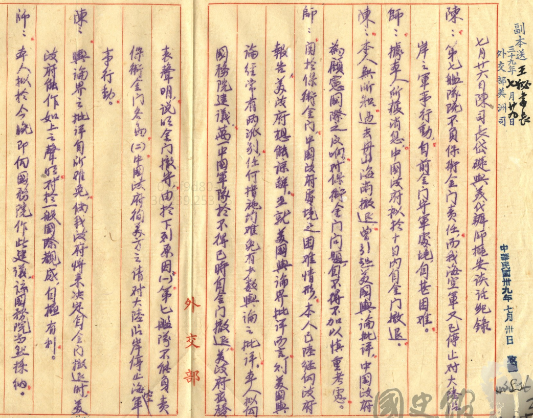 其實這個很多人說關於金馬的問題,要不要從金門撤退,其實當時中華民國因為考慮到這種狀況的嚴峻,所以其實已經考慮要從金門撤退,最早考慮要從金門撤退的,就是蔣中正總統自己本人。在1950年7月26號,就是韓戰爆發後一個月,美國駐華的代辦師樞安又跟葉公超見面,這一次葉公超不在請這個北美司司長陳岱礎代見。陳岱礎就說現在金門的情況很困難,師樞安就說就我得到的消息中國大概在十天之內,你們就要從金門撤退。陳岱礎就說這件事情我不曉得,但是從舟山跟海南島撤退,這點其實都是有過的,為了顧及國際的影響,金門問題我們會慎重考慮。其實在外交上,這就是代表的確是有這個打算。陳岱礎後來就說,如果將來要從金門撤退希望美國能夠進行支援,師樞安就同意了,就說我們馬上向國務院做這樣的建議,在外交上只要是說我現在願意做這個建議,或者是願意轉達你的條件,原則上來講其實就是一種同意。如果我不同意的話,或者是我國政府不同意的話,理論上在現場就是被拒絕。