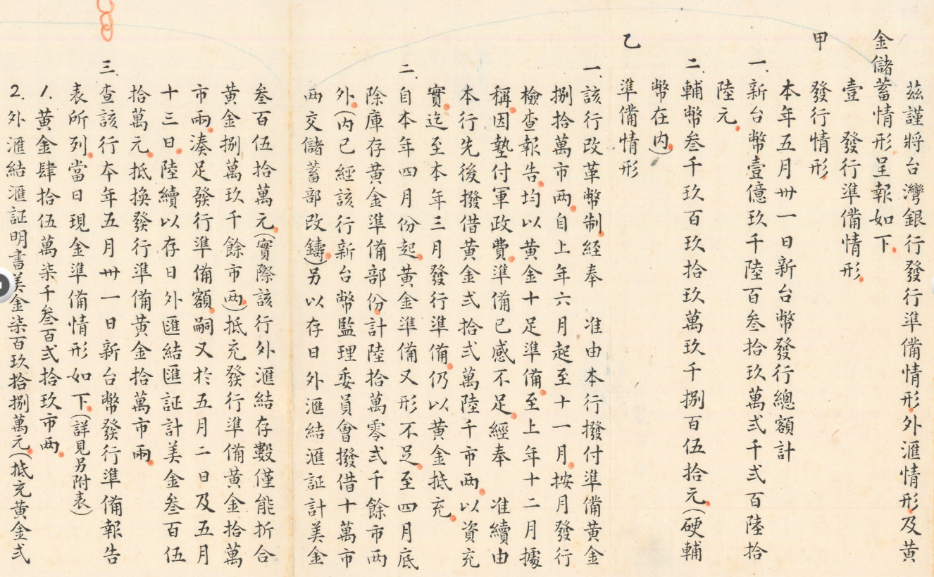 黃金是權威史料,因為這個是當時台灣銀行的總裁俞鴻鈞先生,後來他也當過行政院長,他當時就講到說新台幣當時發行是一億九千多萬元,然後本來是從去年開始撥付黃金,但是早在1949年12月黃金就不足,從本年4月黃金又不足,所以當時講黃金這件事情,老實說這個其實也不是這麼有效。