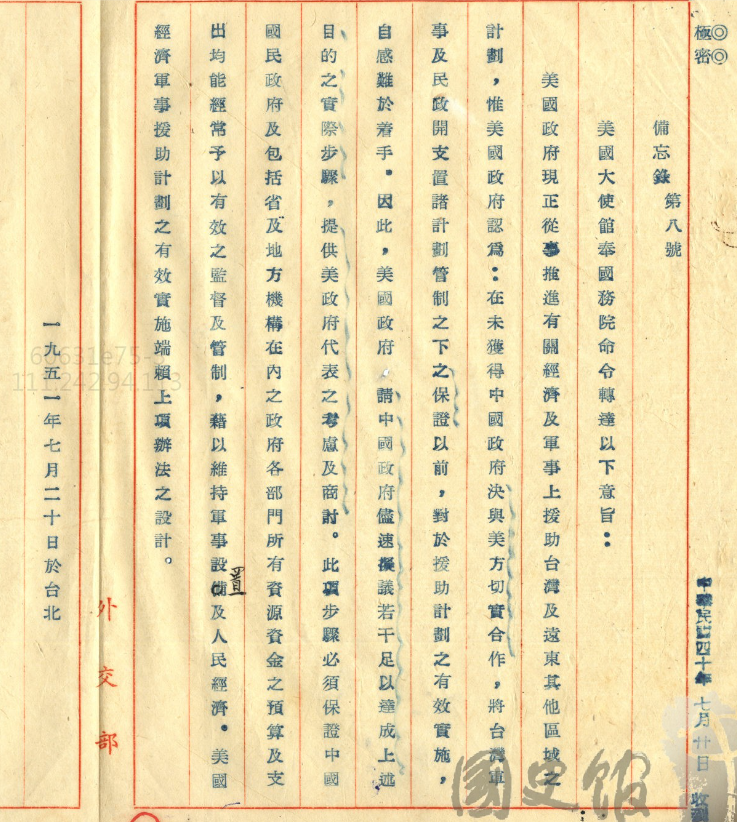 我們再繼續看史料,當時美國其實對中華民國軍事跟經濟的介入也是還蠻徹底的,這個是在1951年7月20日,美國大使館跟中華民國政府說美國政府現在又著手展開計畫給台灣及其他遠東地區以經濟及軍事的援助,但是美國政府對台灣的援助計畫,如果沒有辦法得到中國政府保證有效合作,讓台灣的軍事跟民政支出,置於有計畫的管理之下,那援助是不可能成功的。他的意思是什麼?就是說美國政府覺得我們援助你們,但是我看中華民國在台灣的軍事跟民政支出,沒有計畫、沒有管理,所以這個援助是沒辦法的。所以美國就希望你趕快拿一個辦法出來,然後要來跟我們一起討論,才能夠達到有計畫管理的目的,然後這個辦法要保證,所有可以供中國的政府跟地方部門運用的資源跟各種款項,都要有效的監督跟管理。這個監督管理的辦法必須要跟美國政府一起來討論,這樣子美國對中華民國的經濟跟軍事的援助計畫才有辦法順利完成。