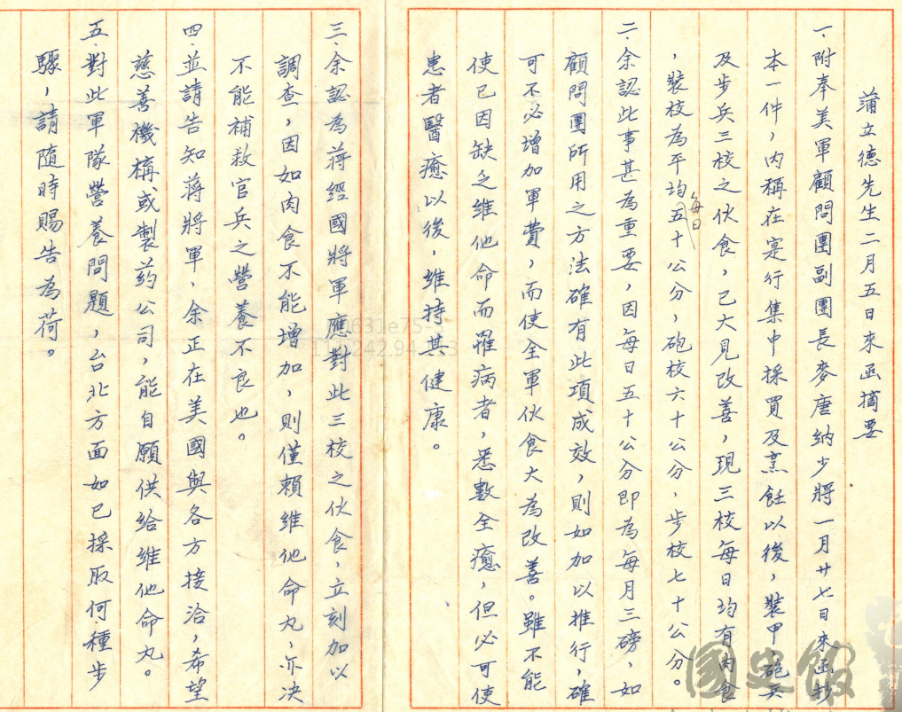 美國當然管得也很細,像譬如說到了1954年,他們還在管一件事情就是國軍吃肉的問題。這是在1954年2月16號,美軍當時在台灣的顧問團副團長叫做麥唐納,他其實是準將不是少將,他說他去看了這個國軍的伙食,裝甲、砲兵跟步兵,三個學校的伙食,他說在實行集中採買跟烹飪以後,伙食大漸改善。意思是什麼?原先的伙食都不太好,而且集中採購也是要在美軍的督促之下,所以伙食大為改善。現在三個學校每天可以吃到的肉食,每日均有肉食,然後裝甲兵學校每天50公克、砲兵學校每天60公克、步兵學校每天有70公克,這個很好。美方認為說這件事情很重要,因為每天50公克,一個月就吃到三磅,如果顧問團所用的方法確有此項成效,則如加以推行,不必增加軍費全軍伙食大為改善。這句話的意思是什麼?第一顧問團所用的方法確有此項成效,代表什麼?你們現在吃肉這是美軍顧問團在規定,第二個加以推行,代表現在還沒有廣泛推行,不必增加軍費而使全軍伙食大為改善,意思就是說其實根本不用增加軍費,只要照我們美軍顧問團的方法伙食就會大為改善,意思就是說你們的伙食不改善的原因是什麼?其實就是被貪污掉。老實說當時美軍顧問團寫公文的人其實滿厲害的,這裡面看起來沒有任何一句質疑的話,都是正面的表述,如果顧問團用的方法有這個成效加以推行,就不用增加軍費全軍伙食就大為改善,看起來都是非常正面的話,其實句句是質疑。看得懂的人就知道他們在質疑什麼。我們有當公務員的朋友可以看得出來這種寫公文的訣竅,那個時候的人其實還是蠻在意這種東西的。