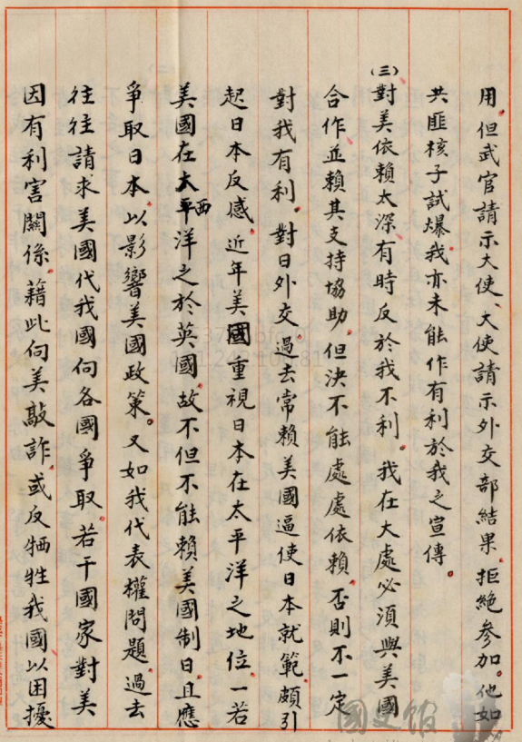(15)對美國依賴太深對我也有時候也不利。我們在大處必須與美國合作並且賴其支持,但是絕對不能夠處處依賴。對日外交過去常賴美國逼使日本就範,頗引起日本反感。各位,今天有沒有人在說美國通過了臺北法案(Taiwan Allies International Protection and Enhancement Initiative (TAIPEI) Act),所以美國可以逼中南美洲邦交國不會跟我們斷交,在臺灣有沒有人在講這種話?有聽過朋友們按個舉手,在臺灣是不是到處有人說美國可以幫我們怎麼樣?現在美國跟我們有邦交嗎?沒有。在60年前美國還有邦交的時候,蔣中正手下的親信就說我們不能夠處處依賴美國,幫我們逼日本就範,這樣會讓日本反感。我們要自己爭取日本,我們也常常希望美國向各國爭取。然後很多國家對美有利害關係,藉機向美敲詐。意思就是說我們在製造美國的麻煩,讓那些國家可以跟美國敲詐,這樣也不好。