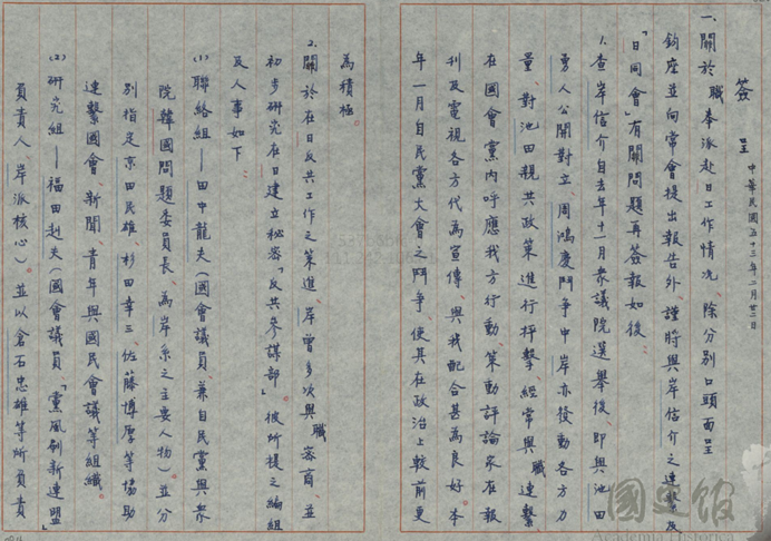 接下來要怎麼樣反共呢?再又過了一年,決定為了這件事情成立一個叫反共參謀部,大家知道嗎?這也是一個蠻神奇的東西,裡面提到岸先生去年以後就跟池田對立,周鴻慶事件的鬥爭中,岸先生也是發動各方力量對池田親共政策進行抨擊,經常跟我方的陳建中先生,他也是蔣先生的一個重要的親信,經常聯繫,在黨內國內呼應、策動評論。所以現在我們希望岸先生跟我們來成立一個秘密的組織,叫做反共參謀部,來實施反共的大業。裡面的聯絡組、研究組名單,這些都是重要人物,像福田赳夫後來也當了首相,還有倉石忠雄這些都是重要人物,意思就是說岸先生是真的回去有在做事,不是隨便講講的,石井光次郎也是一個重要的人物。