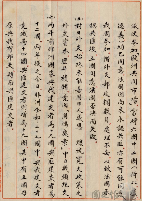 (15)當時還有一件事情,這個也是史料,在法國承認共匪前數月行政院已批示外交部應即派使參加歐洲共同市場,中華民國曾經有加入歐盟的先例大家知道嗎?我們曾經有參加歐洲共同市場的機會,但是當時六國中荷比盧、德國、義大利均已同意,法國因尚未承認共匪亦有可能同意,但外交部延擱數月處理不妥,以致法國承認共匪後,五國同意、法國否決而失敗。大家有沒有看到,中華民國的外交真的是在跟你開玩笑,大家知道嗎?然後對日外交始終未能善用日人感恩總統寬大政策,歷年積錯。且因周鴻慶案中日幾頻絕交。且非洲國家與我建交者原為19國,與匪建交12國,兩年後與我建交減為14國、與匪建交增為19國。這都是在退出聯合國之前幾年的事,所以老實講中華民國在國際間失去地位也不是一朝一夕的事情。