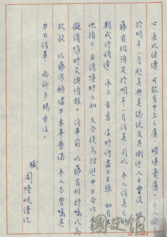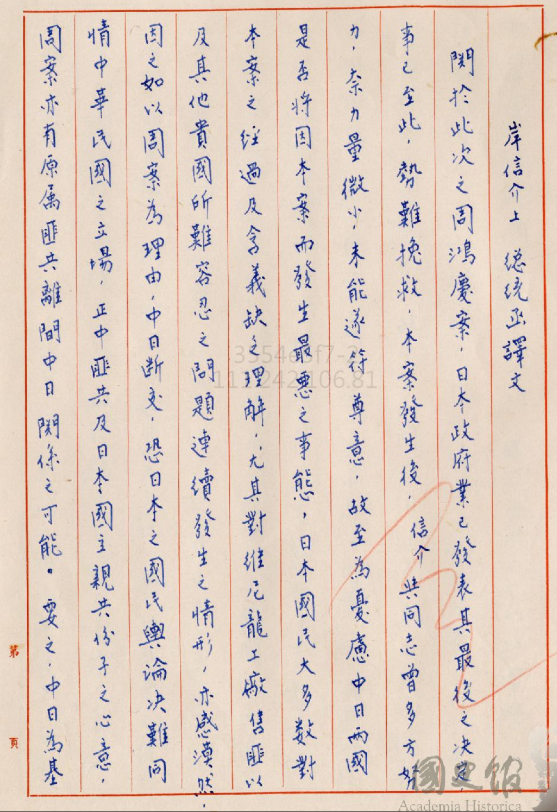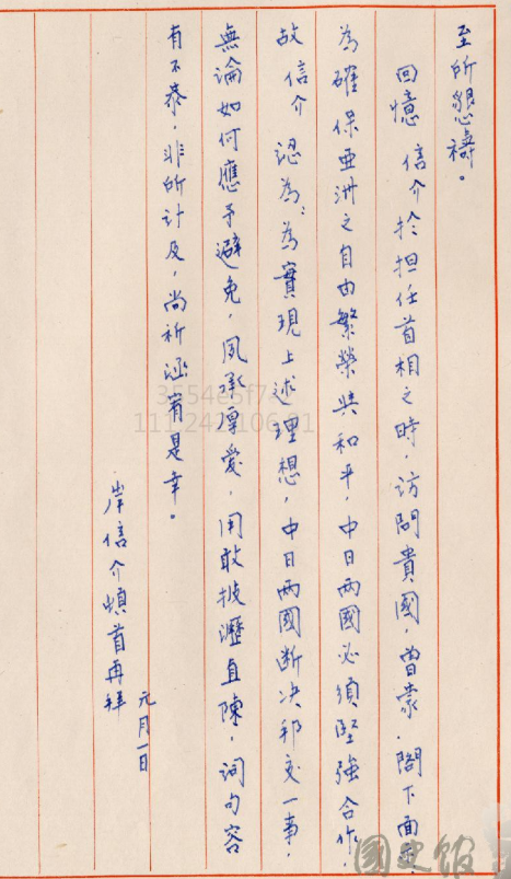 然後中日應該要互相合作建設亞洲的自由與繁榮,而且要徹底反共,確信說將來一定要集中所有力量打倒這種勢力。所以我們一定要繼續不變之親善友好,在這種情況之下,我岸信介跟你報告,希望無論有任何事情一定要盡一切努力,例如斷絕邦交最惡事態,即使是暫時性的也不能夠讓它發生。然後我岸信介認為中日兩國間志同道合人士要加強聯繫。大戰結束後,您對我們日本採取寬大方針,我個人非常的慚愧,希望拜託不要斷交。