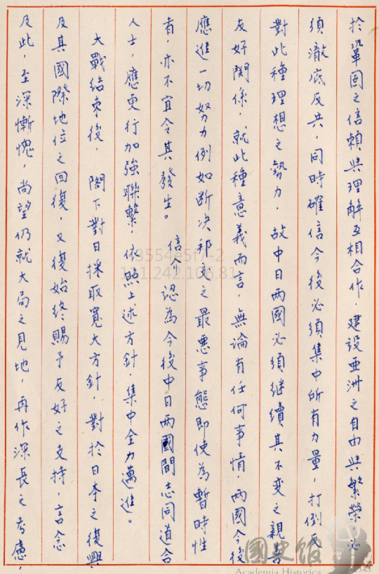 (9)然後中日應該要互相合作建設亞洲的自由與繁榮,而且要徹底反共,確信說將來一定要集中所有力量打倒這種勢力。所以我們一定要繼續不變之親善友好,在這種情況之下,我岸信介跟你報告,希望無論有任何事情一定要盡一切努力,例如斷絕邦交最惡事態,即使是暫時性的也不能夠讓它發生。然後我岸信介認為中日兩國間志同道合人士要加強聯繫。大戰結束後,您對我們日本採取寬大方針,我個人非常的慚愧,希望拜託不要斷交。