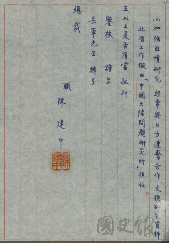 要成立反共參謀部這件事情,重要,所以陳建中請張羣先生轉給蔣先生,字也寫的很漂亮。