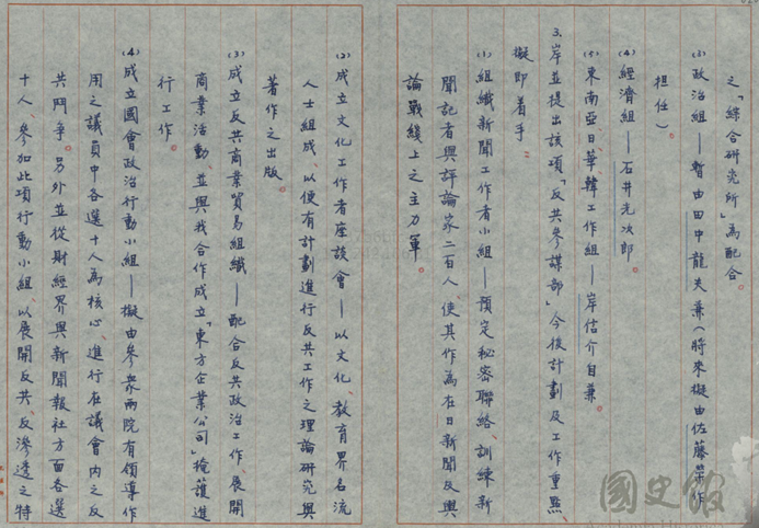 (14)岸先生提出反共參謀部裡面要組織新聞工作者小組,作為在日新聞與輿論戰線上的主力軍,就是1450,大家知道嗎。在日本我們要組織1450,接下來要成立文化工作者,進行反共工作的理論研究跟著作的出版,還要成立一間公司叫做東方企業公司掩護進行工作。然後選20個國會議員,在議會里面進行反共鬥爭,財經界跟報社再各選10參加這個行動,這個弄得很大。接下來還要成立東方企業公司。