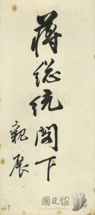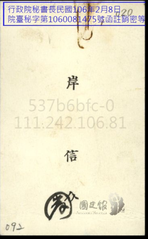 因此在民國53年1964年1月1號,日本前首相岸信介親自寫一封信給蔣先生,他用中文寫蔣總統閣下親展,大家看到他的字還蠻漂亮的,然後岸信介這三個字,大家注意到這是中國的草書,這種簽名的方式是中國古代的一種簽名方式和號稱為畫押,也就是說他的名字寫法是一種特殊的筆法,以防止偽造,這個稱為畫押。現在在日本重要人物在簽字的時候,還是有這樣的習慣,韓國也有。