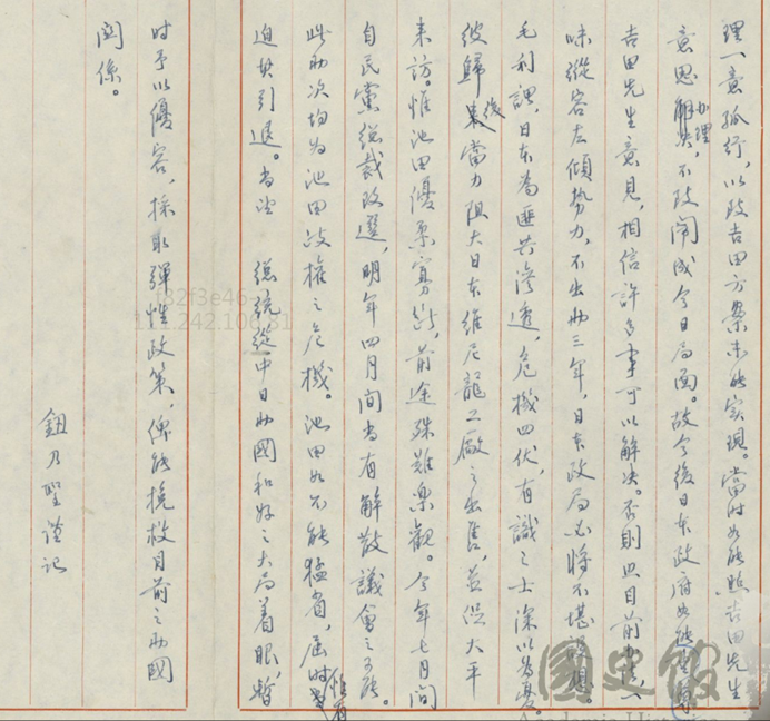 (12)現在日本政府老實說,如果把這個吉田先生派來的話,什麼事情都可以解決了,要不然現在來講,再過兩三年你們日本政局也會不穩,然後你們日本就會被匪共滲透危機四伏,所以問題是在你們日本身上啊。大平來訪當然也是很好,但是我看你們池田首相優柔寡斷、前途殊難樂觀,今年七月自民黨總裁改選,明年四月又要解散議會,如果你還是池田政權,老實說池田如果再不反省,然後你們再不逼他引退,這也是不行的啊。所以我從中日兩國和好大局著眼,我暫時容忍你們池田,不是你們容忍,是我忍耐你們啦,我採取這個彈性政策,希望你們能夠挽救既有的關係。大家知道嗎?這是歷史文件,不是我們在開玩笑的。