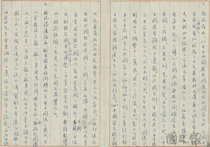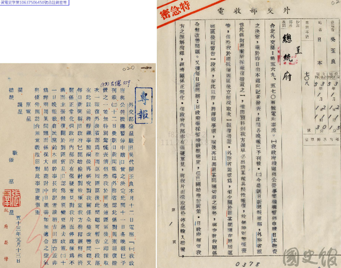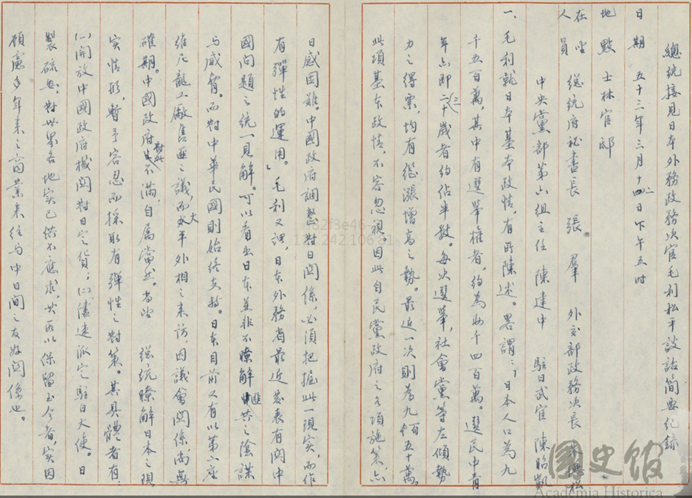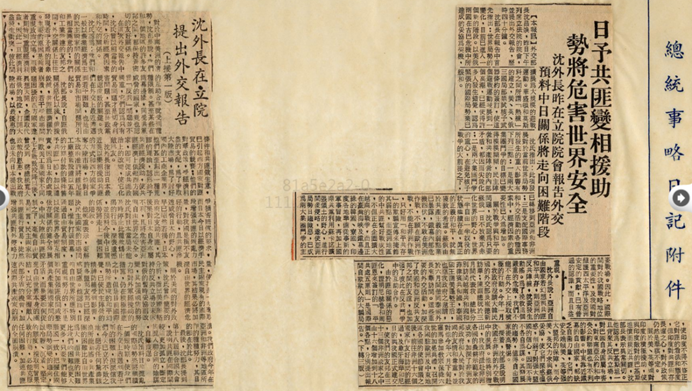 文件一:〈張羣先生文卷─總統與日人談話紀錄(一)〉,《蔣中正總統文物》,國史館藏,數位典藏號:002-110400-00005-016