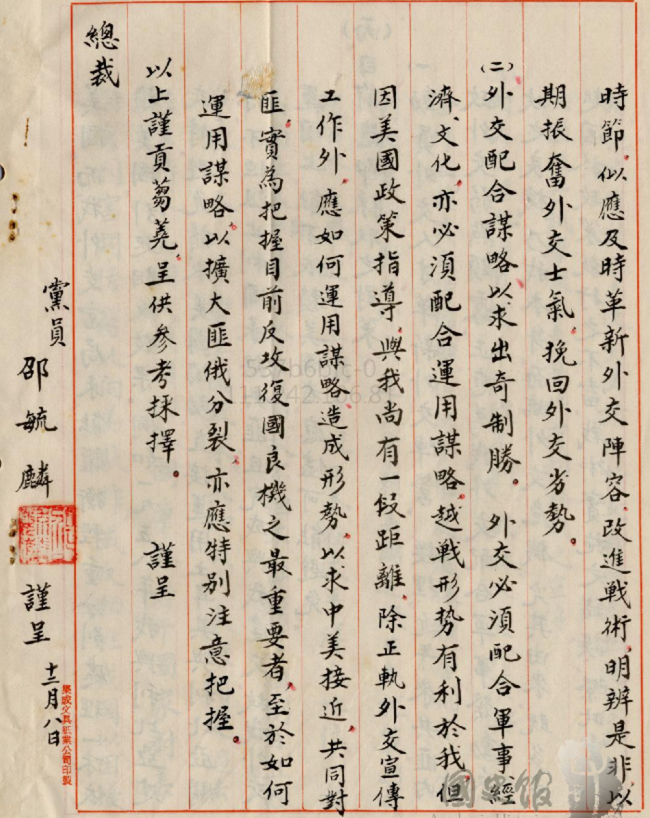 在這樣的情況之下,他說我們要動員外交人才革新外交陣營,外交要配合謀略出奇制勝等等,最後是黨員邵毓麟謹呈總裁。大家看這個文件有沒有即視感?今天臺灣有沒有人敢用這樣子的語氣語調,敘述臺灣的問題寫給現在政府知道?我想這些都是在這些檔案看到,讓我覺得臺灣怎麼樣能夠不要再走這些過去的老路,我覺得其實是非常重要。從這些我們會看到歷史常常是偶然的,是怎樣的選擇造成怎樣的問題,所以我們常說善不一定有善報,惡不一定有惡報,但笨一定有笨報。