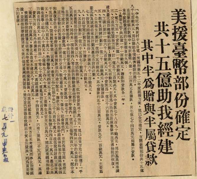 美國對蔣先生除了外交上軍事上相當的禮遇之外,他們還做了什麼事情?1963年同一年在蔣中正看過航空母艦之後幾天,7月28日美國又宣佈援助中華民國經濟建設。這次經濟建設有哪些方面?有農業、電力、交通跟觀光發展方面,其中包括基隆高雄兩港的擴建、台北國際機場航站計劃,這些都是美援贈款。還包括整修台一線,然後還包括幫我們恢復故宮博物院。大家知道嗎?故宮博物院大家都說是中華文化的象徵,實際上是誰恢復的?是美國幫我們蓋的,是美國送錢援助我們把故宮博物院蓋起來,這也是蠻有意思的事情。