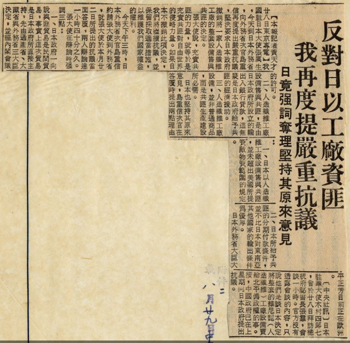 (5)接下來就發生了一件事情,同一年1963年、民國五十二年9月21日,當時的外交部長沈昌煥說日本給予中共變相援助,實在是危害世界安全。他說匪俄關係惡化之後,共匪經濟瀕於崩潰,很多西方國家異想天開,這點很糟糕,特別是日本非常糟糕。為什麼呢?因為他變相援助共匪,跟西方爭奪大陸市場。這點是要譴責,因為日本的處境跟歐美不同,他在戰敗之後受到蔣總統寬大的恩惠,我們也沒有向日本提出戰爭賠償。日本今天用經濟手段增強共匪的叛亂,對我國是極不友好,所以我們表示這樣的方式是非常糟糕。