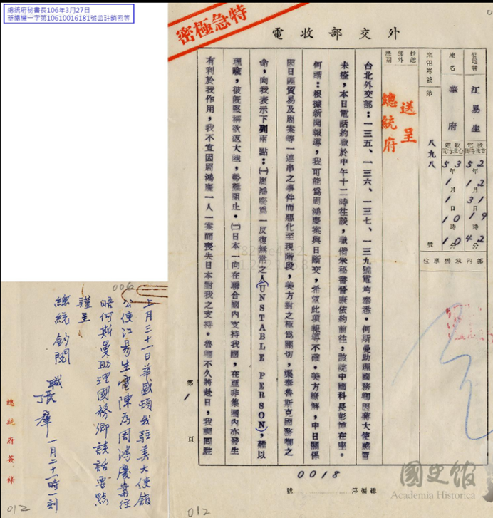 文件十一:〈外交—駐外單位之外交部收電(一)〉,《蔣經國總統文物》,國史館藏,數位典藏號:005-010205-00146-020