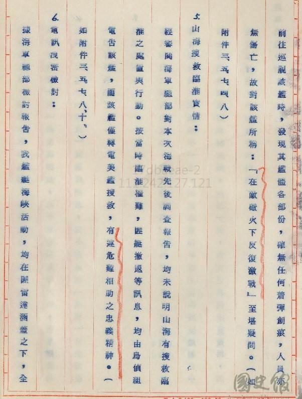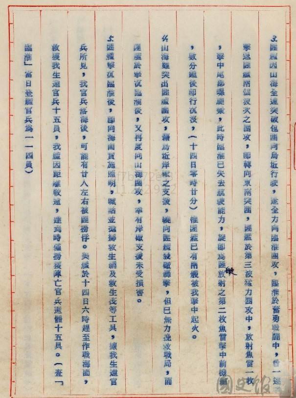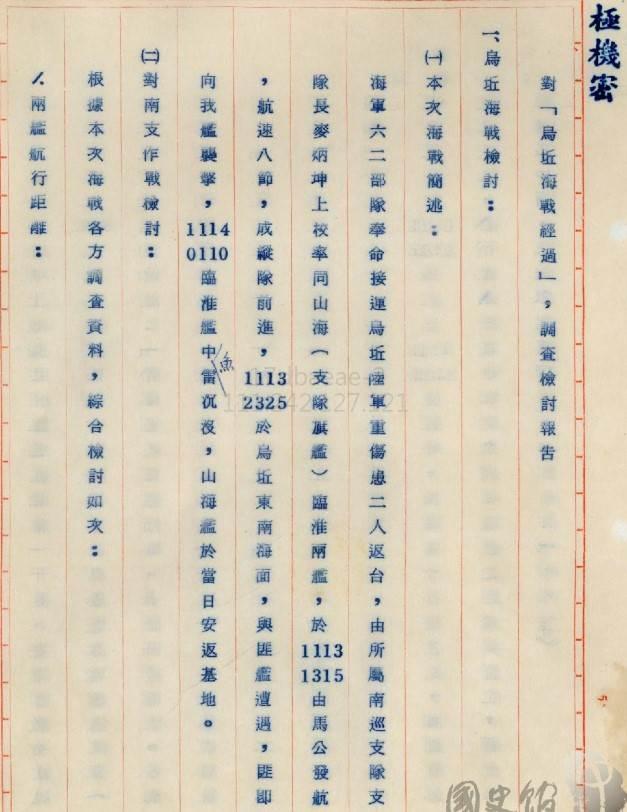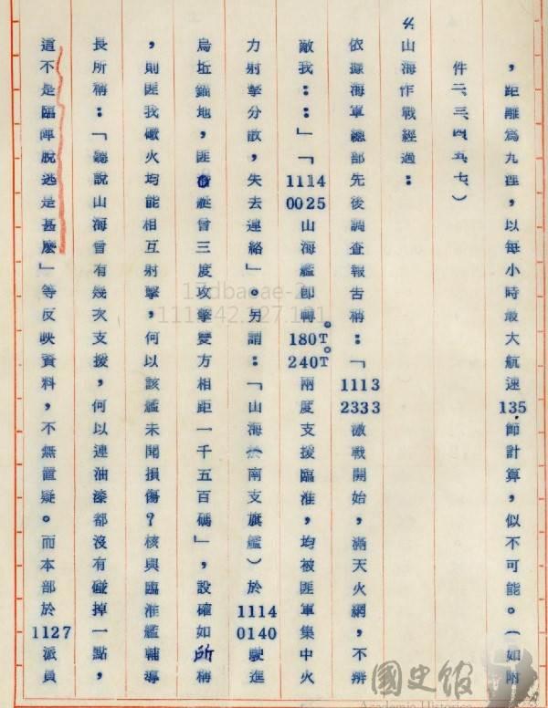 山海艦就說11月13號23點33分炮戰開始,滿天火網,不辨敵我,11月14號0時25分趕快支援臨淮艦,但都被匪軍集中火力射擊分散失去聯絡。意思就是說匪軍火力很強,我們實在是沒辦法聯絡到臨淮艦,到了11月14號凌晨1點40分,駛到烏坵了,匪艇追過來打但是雙方炮火能夠相互射擊,但是山海艦毫無損傷,山海艦的油漆都沒有碰掉一點,這不是臨陣脫逃是什麼?所以蔣經國特別把它用紅線畫起來說就是臨陣脫逃,尤其屬下這樣報告。