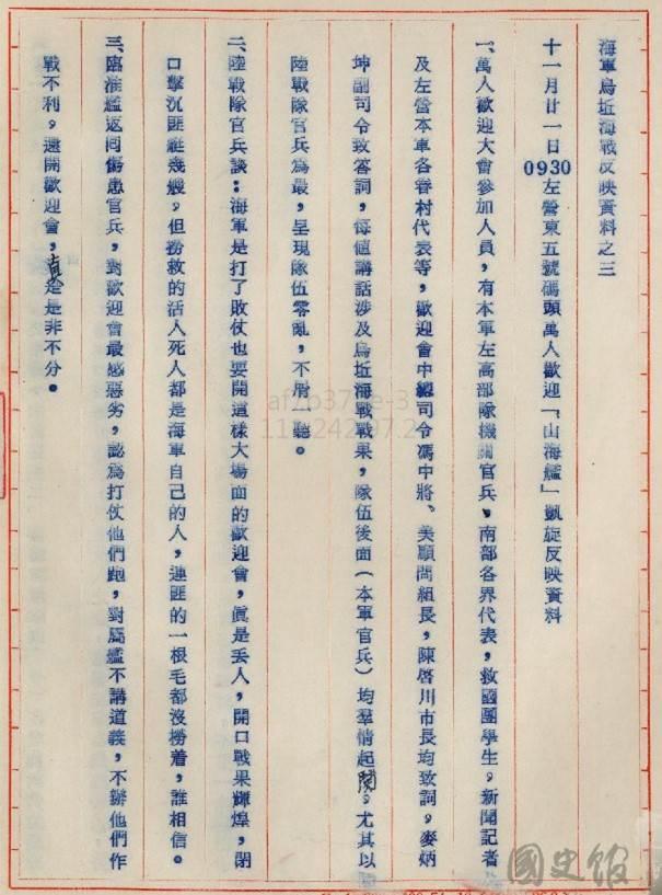(1)再來是烏坵海戰反映資料,各位朋友看這種舊的史料,只要看到「反映資料」就是那種情治機關去收集的,甚至是說有人在講的時候,有人在那邊聊天,旁邊就是有人把它抄下來,所以叫做反映資料。這個反映資料就說11月21號萬人歡迎山海艦凱旋的時候,結果隊伍後面本軍官兵群情起鬨,陸戰隊官兵為最。開口戰果輝煌,擊沉匪艇幾艘,但撈救的活人死人都是海軍自己的人,連匪的一根毛都沒撈到,誰要相信。所以代表當時其實還是有敢講話的人,還是有人有道德勇氣,歡迎大會下面後面的軍人,就是大家還是有道德勇氣在那邊起鬨不聽。各位想一想,那是在戒嚴時期,而且是在軍中,敢這樣子其實是要需要很大的勇氣。臺灣到了今天,要有這種道德勇氣,敢這樣子用這種起鬨來表達一點對文過飾非的不滿,發揮一下對那些犧牲的人的支持,我覺得也是蠻不容易的。蔣經國派去的人就把這些都記錄下來了,這些官兵私下的談話,大家看到都被蔣經國記下來,所以也真的那個時代,老實講控制是非常嚴密的。