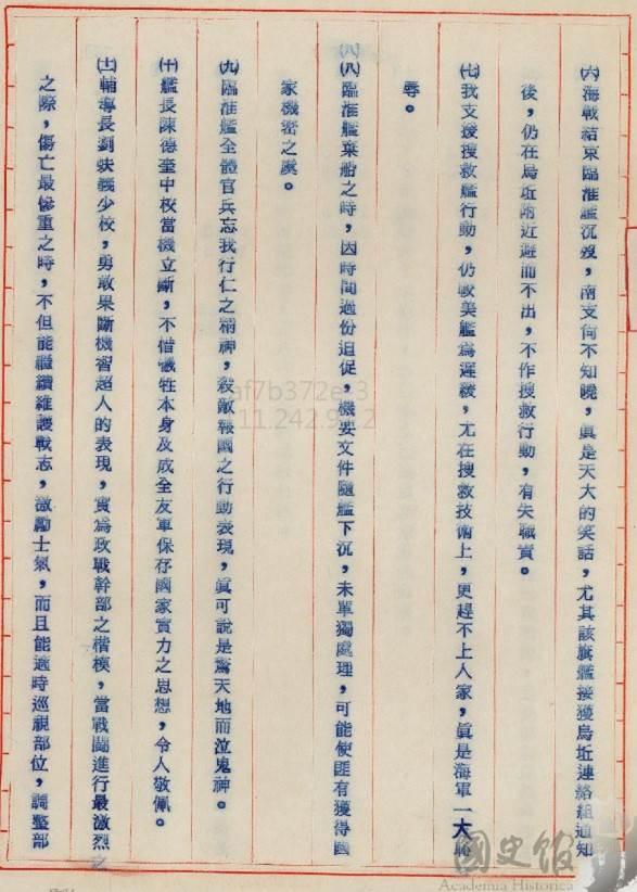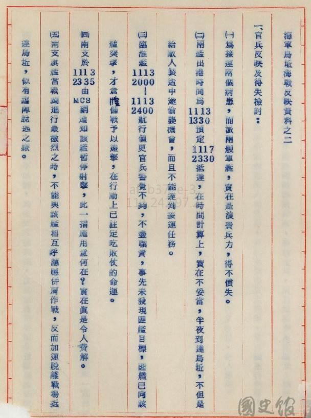 大家看到這句話是關鍵,我支援搜救艦行動,仍較美艦遲緩。意思是說誰去撈救我方這些生還的官兵?還是要靠美軍嘛,對不對。就是說打仗沒有在打,然後撈救也要靠美軍。後面提到臨淮艦官兵的勇敢,我覺得是還算是蠻不錯的,大家就參考。再來是相關的檢討,這個我們就參考一下。