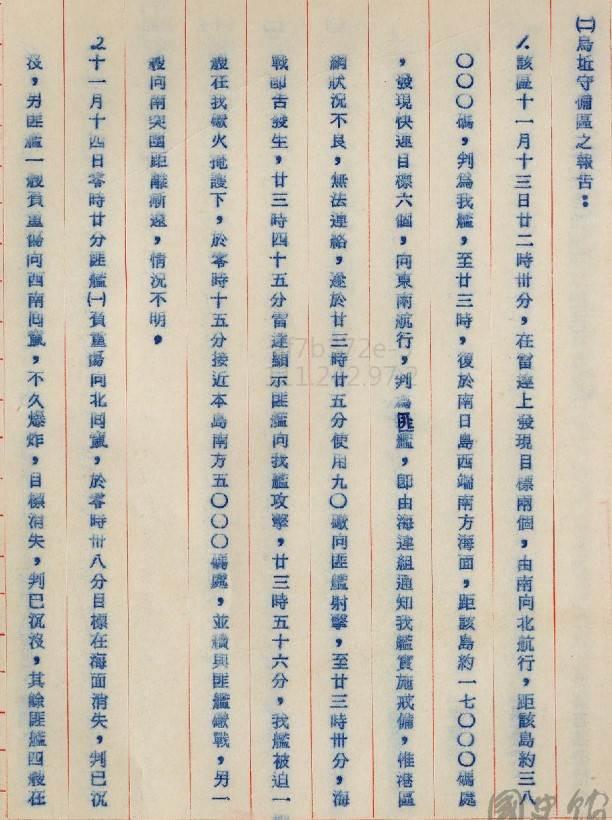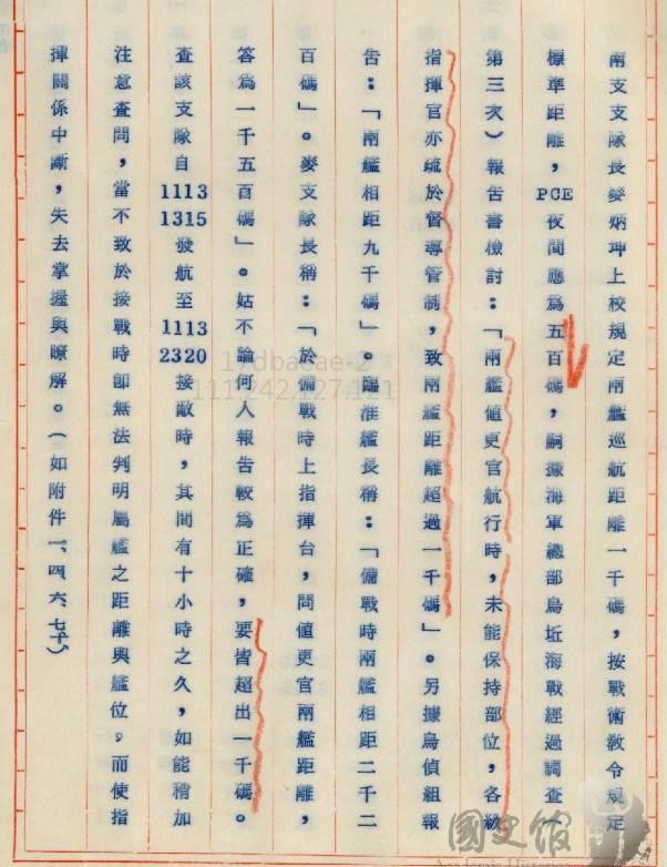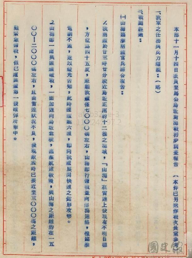 (1)這個是初步調查報告,這個就講的更加詳細。在23點20分,匪艦艇6艘即向我艦展開快速的鉗形攻擊,另外一方面我艦的雷達狀況不良,發現敵艦時已接近到3000碼的距離,雖緊急備戰,但已遭匪艦第一發炮彈擊中,這個顯然就是吃虧。
