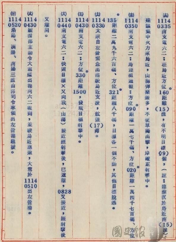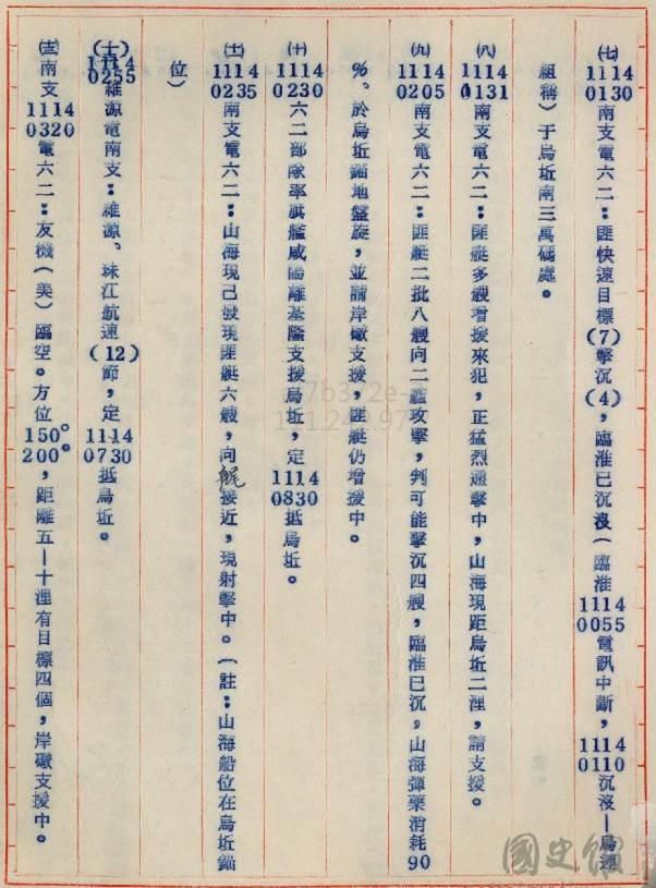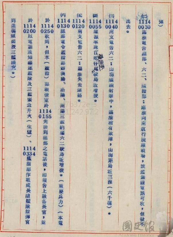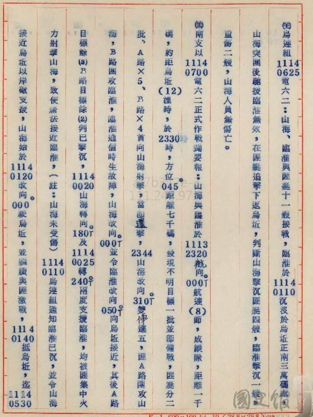 (1)這個是有關電報的抄件,就是幾點幾分做了什麼事情,大家看到在11月13號的2330,17,000碼處發現不明目標5個接戰中。2350快速目標5個持續接近,匪軍真的來了。然後2400臨淮電告山海說已經跟匪接戰,開打了。凌晨0點15分雙方又在打說現在請求支援。