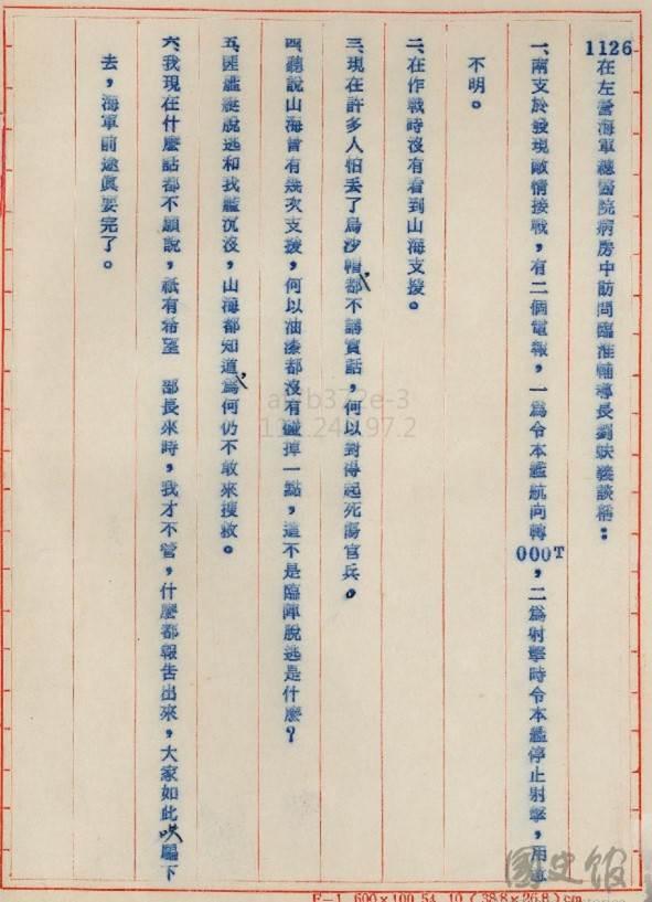 (1)再來是11月26號訪問左營海軍總院病房住院的臨淮艦輔導長,他說作戰時沒有看到山海支援。現在很多人怕丟了烏紗帽不講實話,何以對得起死傷官兵。聽說山海曾有幾次救援,何以油漆都沒有碰到一點,這不是臨陣脫逃是什麼?然後匪艇脫逃,我艦沉沒,山海都知道,為什麼不敢來搜救呢?我現在什麼話都不願說,只有希望部長來時候我才不管,(部長就是蔣經國了),什麼事情都要報告出來,大家都在哄騙的話,海軍前途就真要完了。意思就是說蔣經國在當時還是有一定的威望,大家還是覺得說跟他陳情還是有效的。