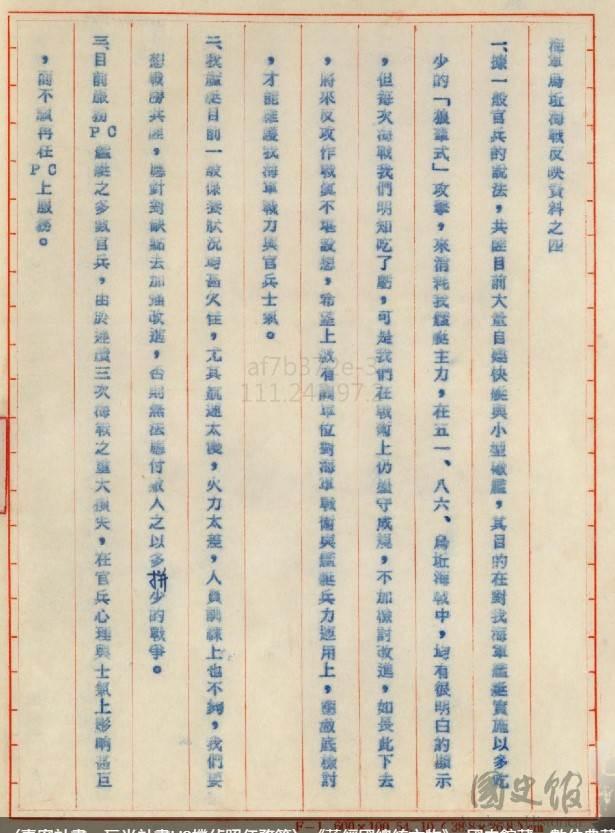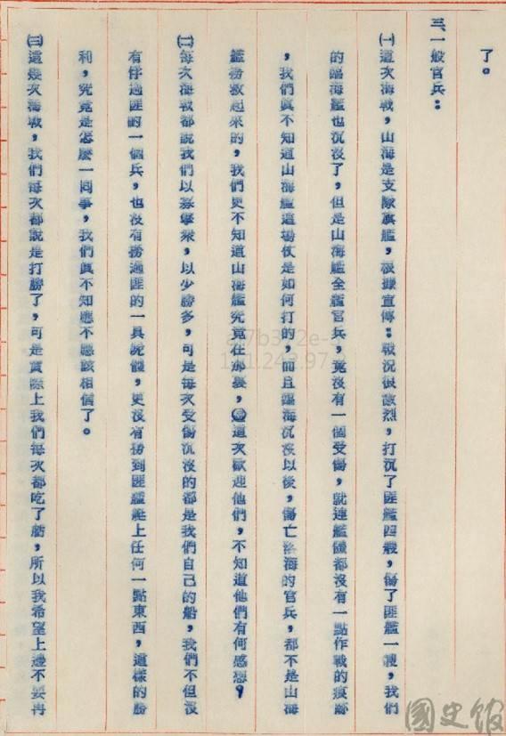 (1)一般官兵講得更直接了,這次海戰山海艦是支隊旗艦,根據宣傳打沉四艘匪艦,傷了匪艦一艘,然後我們的臨淮艦也沉沒了。但是山海艦全艦官兵沒有一個受傷,艦艇沒有一點作戰的痕跡,每次海戰都說我們以寡擊眾,以少勝多。可是每次受傷沉沒的都是我們自己的船,我們沒有俘過匪的一個船一個兵,也沒有撈過匪的一具屍體,更沒有撈到匪艦艇上任何一點東西,這勝利究竟是怎麼一回事,我們真不知應不應該相信。所以就很清楚,這場海戰是誰贏了?匪方嘛對不對,然後他們有沒有沉?很明顯他們根本沒有沉,因為完全沒有撈到他們任何一點東西,活的死的東西都沒有,因為真正在撈的是誰?剛才的報告裡面提到是美艦在撈,所以如果有匪方的東西,美艦會不撈嗎?所以如果有撈到匪方的人,不管是死的活的就是我方的戰果,對不對?所以這是一個非常殘酷的指責。但是大家注意到這些官兵敢講這些大逆不道的話,因為他們是在跟誰講話,大家知道嗎?對不對,這些是蔣經國派去的政戰體系的人去收集的,所以大家可不可以理解說為什麼臺灣人不分本省外省會這麼崇拜蔣經國?大家可不可以理解這個概念?就是覺得說在那種這麼封閉的時代,好像還有一線光明,還有一個人相對比較英明,可以聽得到大家的聲音,就是誰?就是蔣經國!所以老實說臺灣要從轉型正義去把它做好,真的要從理解中華民國的近現代史著手,這也就是我覺得說雖然我這25次的讀書會看了數百數千份的文件,近視老花兩個都在成長,但我覺得這個真的對臺灣來講還是蠻有需要的。