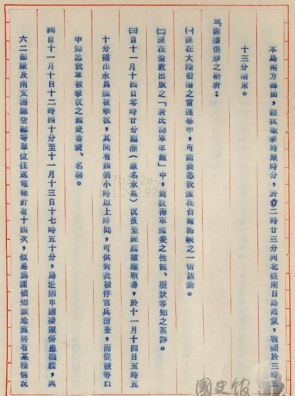 (1)然後是匪方情況的研析,第一個就是匪的雷達可以偵測我們的一切活動,第二是匪方從倫敦出版的詹氏戰船年艦中對我海軍艦隻性能知之甚詳,然後匪基本上來講又可對我被俘官兵清查,藉此知道我軍被擊沉之艦隻的番號與名稱。