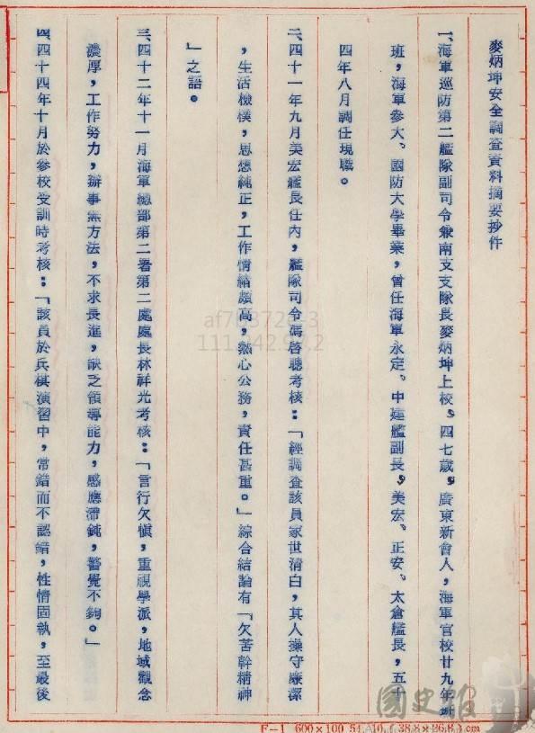 這個就是麥炳坤安全調查資料抄件,大家看到當時特務系統對軍官的調查,家世清白、操守廉潔生活簡樸,但是欠苦幹精神、言行欠慎、缺乏領導能力、辦事無辦法。也就是說當時這些安全調查資料其實還是蠻恐怖的。