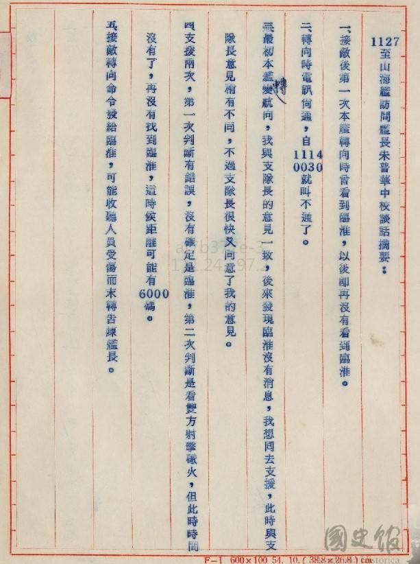 然後是山海艦支援臨淮艦的經過,就是山海艦就是前面這艘跑掉的,說本艦改變航向,後來發現臨淮艦沒有消息,我想回航支援,支援兩次,第一次判斷錯誤,沒有確定是友艦。第二次是判斷看到雙方涉及炮火,然後但是時間遲了,再沒有找到他了。當時距離約有6000碼,那個時候臨淮艦就是沉船了。