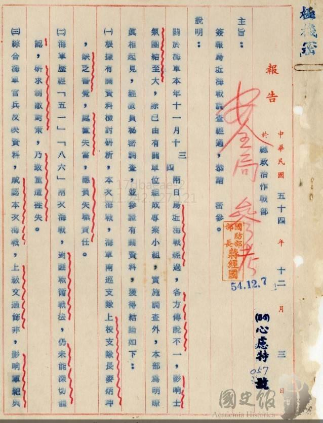 接下來就是我們來看今天的史料,這是1965年12月3號,由當時總政戰部主任唐守治,簽報烏坵海戰調查經過檢討報告,其中還有包括另外一件民國51年的一件誤航的事例。這份文件直接呈報給當時的國防部長蔣經國先生,所以現在列在國史館的蔣經國總統文物裡面。我合理的認為這些資料應該是先向蔣中正總統呈報,之後蔣中正再下令轉給蔣經國看。當然也有可能是蔣經國看了之後,再直接呈交給蔣中正。不過我認為前者可能性很大,因為蔣中正老實講是蠻喜歡直接領導,所以就會跨過中間的階層,直接去詢問比他低很多的部屬問說你們到底在幹什麼。這點是蔣中正先生的一個特色,1965年的時候他已經快要 80歲了,但是對於軍事的問題還是蠻用心的,所以這種跨越多個階層直接領導的情況其實是蠻多的。