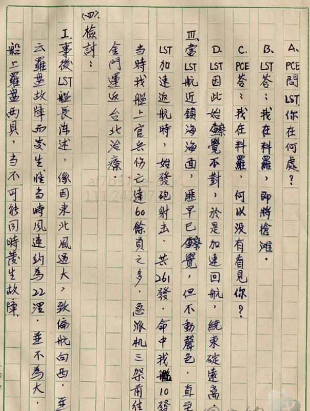 我們繼續來看誤航事件的內容,民國51年出動了一艘登陸艦(LST)運補金門,物資約2000噸,人員有400個,出動了一艘巡邏艦(PCE)護航,然後27號出航後原定當晚2300在A點會合,但兩艦艦長認為說運補金門乃一經常的任務,航線熟悉,不用會合,各自航進。第二天早上6點08分護航艦(PCE)抵達料羅灣,但是沒有看到登陸艦(LST)的蹤影,於是就呼叫了,無線電呼叫概要如下。